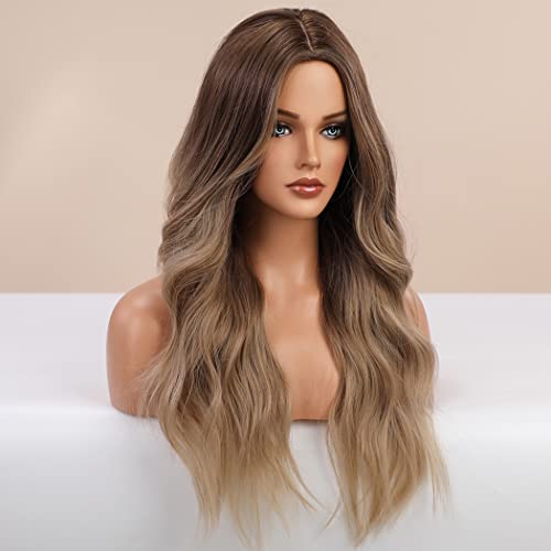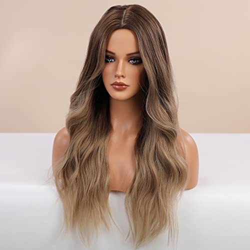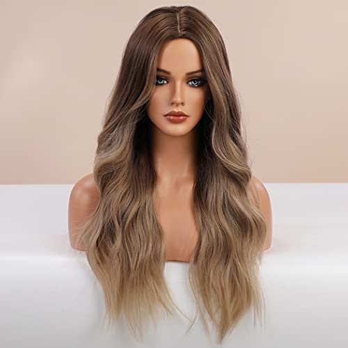 DILLARDS - باروكة شعر طويل بلون أشقر غامق، باروكة شعر للنساء مقاومة للحرارة بفرق في المنتصف، باروكة شعر بلون بني متدرج يومية مع غطاء رأس من تانتاكو من ديلاردز (بني متدرج #0333)