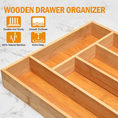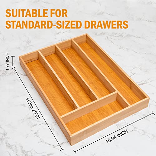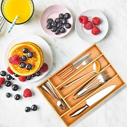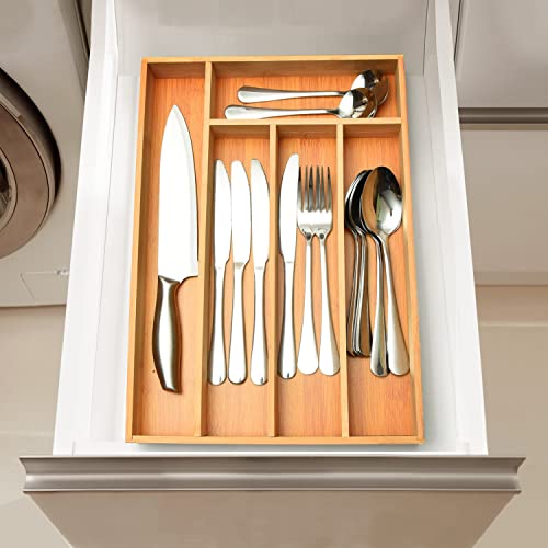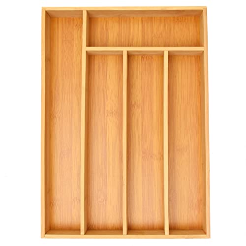 Dinaso - منظم ادوات المائدة الفضية من الخيزران، منظم ادراج من الخيزران - 5 اقسام صينية فضية للمطبخ للادراج، صينية ادوات خشبية لحمل الاواني والملاعق والشوك والسكاكين