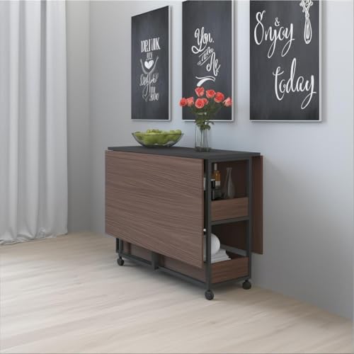• التصميم العصري: طاولة طعام أنيقة بسطح خشبي بني وإطار معدني أسود، مثالية للمساحات العصرية