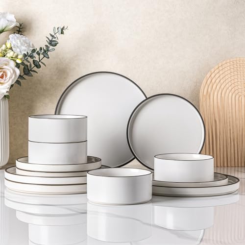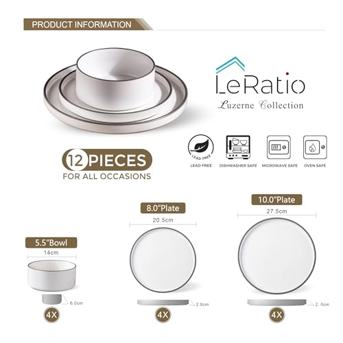 LERATIO - طقم عشاء مكون من 12 قطعة من أطباق وبولات من الفخار يناسب 4 أشخاص، طقم عشاء مقاوم للكسر والخدش، آمن للاستخدام في غسالة الصحون والميكروويف، أبيض بحافة سوداء