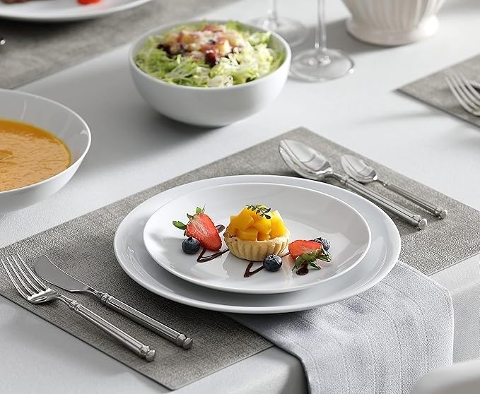 - محتويات العبوة - تتضمن مجموعات أدوات المائدة البيضاء المكونة من 6 قطع أطباق عشاء مقاس 9.7 انش وأطباق حلوى مقاس 7.4 انش وأطباق شوربة سعة 26 اونصة وأوعية 19 اونصة. كل مجموعة عشاء متعددة الاستخدامات ومناسبة لبيئات الطعام المختلفة وتجلب تجربة طعام مبهجة لعائلتك.