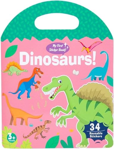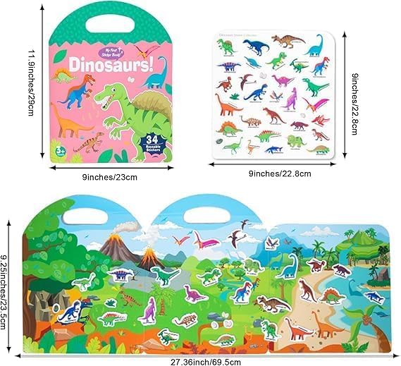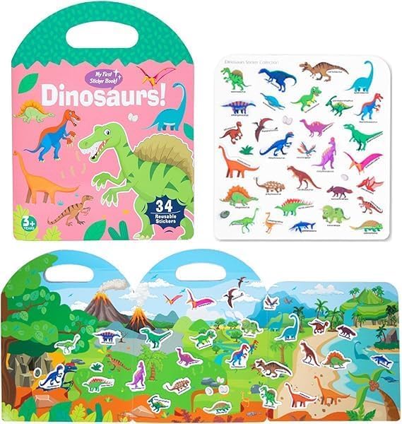 Generic - كتاب ملصقات الديناصورات للأطفال، 34 ملصقاً قابلاً لإعادة الاستخدام مع مناظر طبيعية، للأعمار 3 سنوات فما فوق