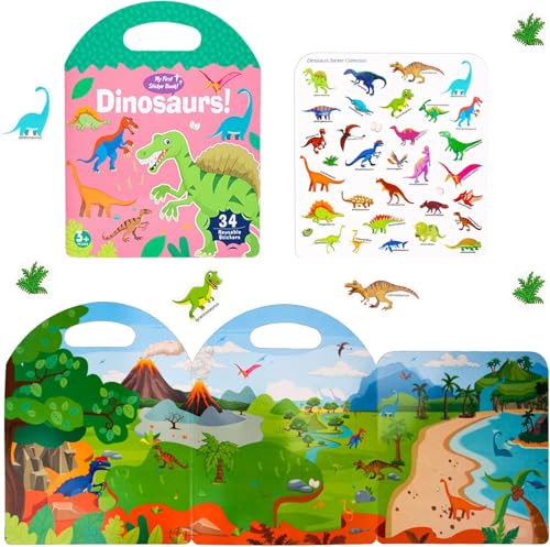Generic - كتاب ملصقات أشكال الديناصورات مع 34 ملصق وأشكال مناظر طبيعية قابلة لإعادة الاستخدام، للأعمار من 3 سنوات فما فوق