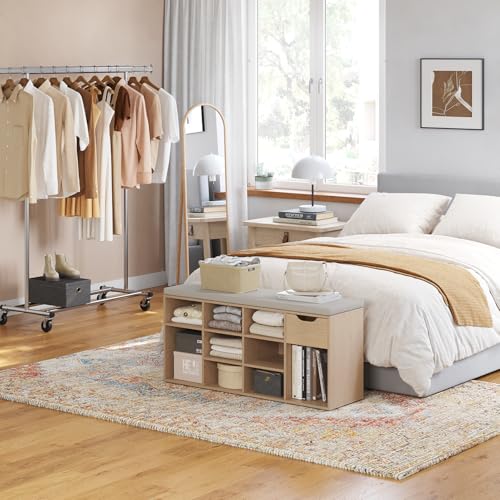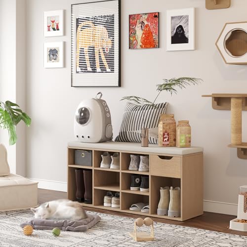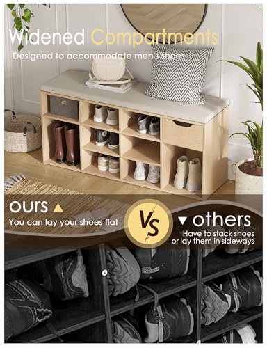 DINZI LVJ - دينزي ال في جيه مقعد تخزين احذية مع وسادة، 11 مقعد مدخل مكعب مع درج وارفف قابلة للتعديل، رف احذية طويل 40.9 انش لغرفة المعيشة وغرفة النوم وغرفة النوم، لون بيج طبيعي وكابتشينو