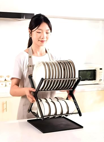 Generic - مصفاة أطباق ومنظم تخزين بمستويين مع درج على شكل حرف X مقاوم للتسرب وحامل أطباق صغير لتجفيف الأطباق بشكل منظم في مساحة مطبخك (اسود)