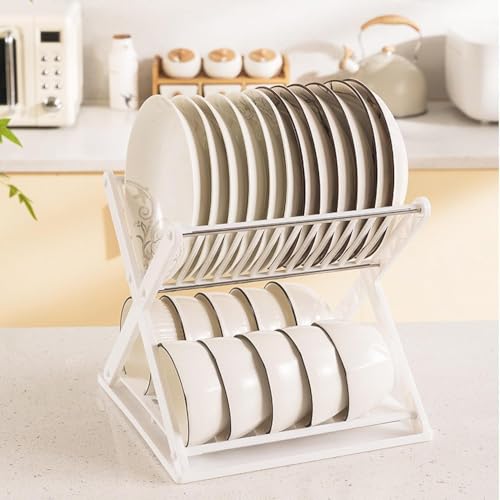 Generic - صفاية ومنظم اطباق و بولات 2 دور مع درج مانع للتسريب حامل شكل X بحجم مدمج للوضع على المطبخ لتنظيم وتجفيف الاطباق بلاستيك ابيض