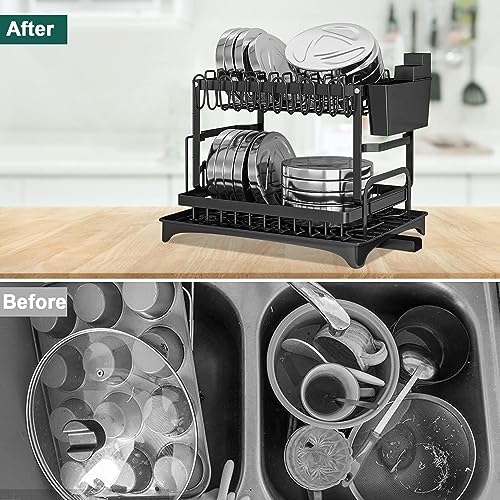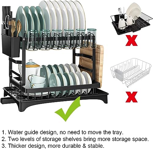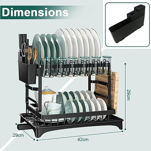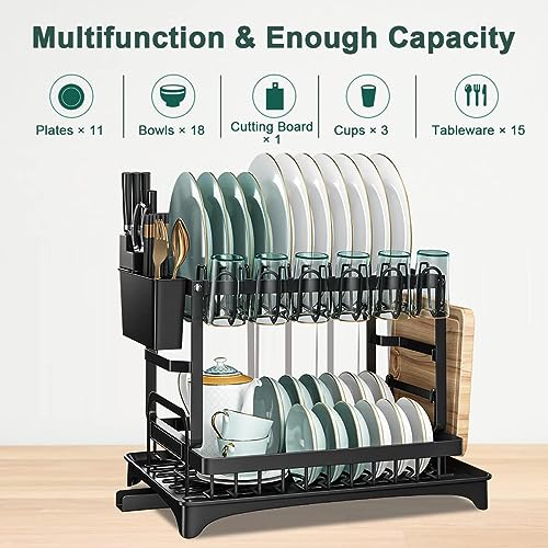 - 【تصميم من طبقتين ورف أطباق بسعة كبيرة】 يتميز رف تجفيف الأطباق متعدد الأغراض بمستويين من التخزين ومحاط برفوف السكاكين وعيدان الطعام ورفوف لوح التقطيع، مما يلبي احتياجات التخزين والتجفيف في المطبخ. يمكن للطبقة الأولى حمل الفواكه والخضروات وأواني القهوة والأكواب أو ما يصل إلى 11 طبقًا. الطبقة الثانية تحمل كؤوس النبيذ والأوعية والأطباق والزجاجات أو ما يصل إلى 18 وعاء، مثالية لسطح العمل المحدود في المطبخ.