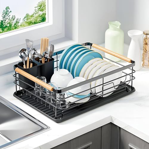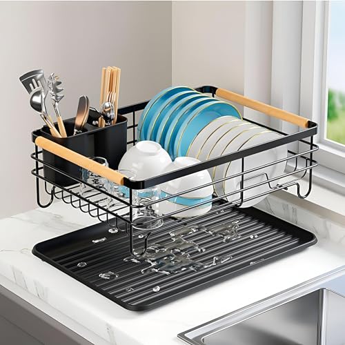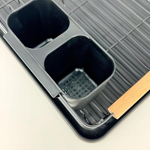 Generic - رف تجفيف الاطباق - منظم مطبخ معدني اسود انيق مع صينية تصريف مدمجة وحامل للاواني، مقاس 43 × 32.5 × 14 سم، يحمل ما يصل الى 9 اطباق لتخزين فعال وموفر للمساحة.
