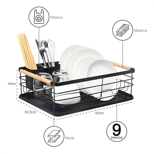 - يوفر رف تجفيف الأطباق هذا سعة واسعة من 9 أطباق بأبعاد 43 سم × 32.5 سم × 14 سم، مما يزيد من مساحة الطاولة مع تنظيم الأطباق والأوعية والأكواب وأدوات الطهي بأناقة في وحدة واحدة أنيقة تكمل جماليات المطبخ الحديثة.
