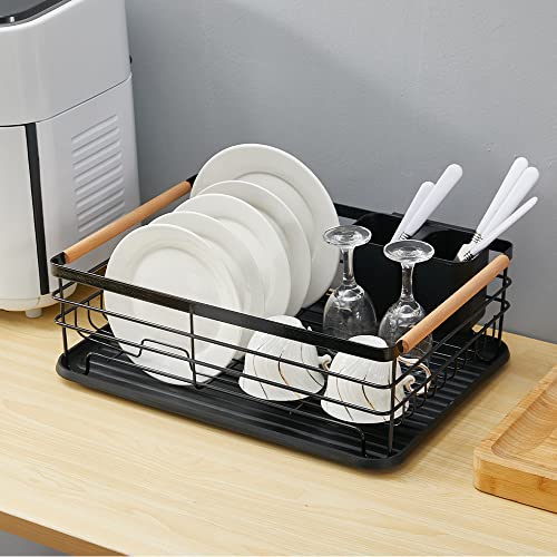 ZHIQISHI - رف للاطباق، رف اطباق مع صينية تنقيط قابلة للازالة، منظم رف تجفيف المطبخ المعدني بمقابض خشبية، ابيض، 43 × 30.5 × 14 سم (اسود)