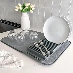 Generic - رف لحمل الأطباق مع بساط تجفيف للمطبخ، صفاية أطباق من الفولاذ المقاوم للصدأ بسعة كبيرة مع حامل أدوات وحامل فوط، منظم طاولة قابل للطي وموفر للمساحة، لون رمادي
