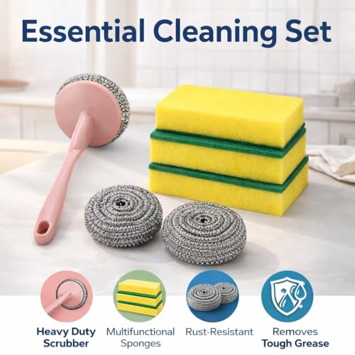 Generic - أداة تنظيف أطباق بمقبض طويل مع إسفنجات وفرشاة سلكية مصنوعة من الفولاذ المقاوم للصدأ وقابلة للإزالة لغسل الصحون والمطبخ، طقم تنظيف 6 قطع، وردي