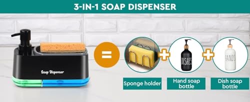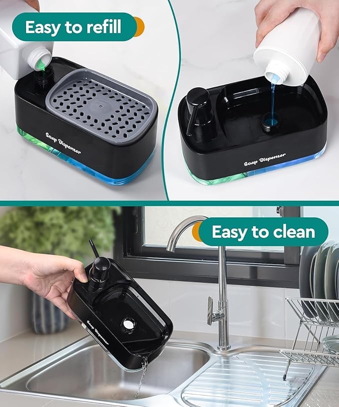 - وظائف متعددة الاستخدامات 3 في 1: يتميز موزع الصابون وحامل الإسفنج الكل في واحد بحاويتين منفصلتين للصابون مما يسمح لك بتخزين صابون اليد وسائل غسيل الأطباق في نفس الوقت. كما أنها تتضمن حامل إسفنجي مدمج لسهولة الوصول والتخزين الأنيق. يساعد التصميم الذكي الموفر للمساحة على الحفاظ على مطبخك منظمًا مع تحسين كفاءة التنظيف اليومية.