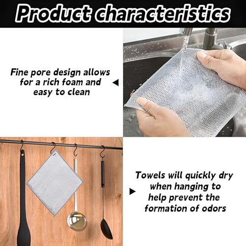 - بفضل الحجم الصغير الذي يبلغ 20 × 20 سم وعملية تصنيع شبكية ماسية تسمح بتحرير الماء السريع والتجفيف السريع، يمكن تعليق هذه الأقمشة بسهولة على جدران المطبخ بعد الاستخدام، مما يحسن المساحة ويحافظ على النظافة في منزلك.
