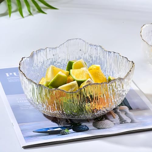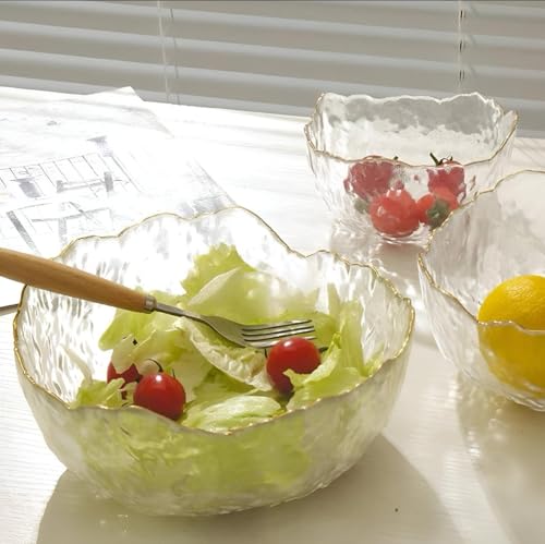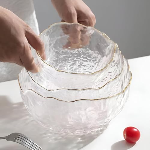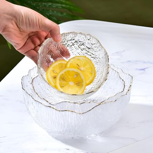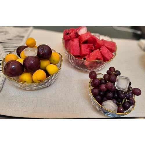 - مجموعة من ثلاثة أوعية زجاجية شفافة تتميز بملمس مموج مطروق وحافة ذهبية رقيقة، مما يوفر قطعة مركزية ممتازة وعاكسة لأي طاولة.