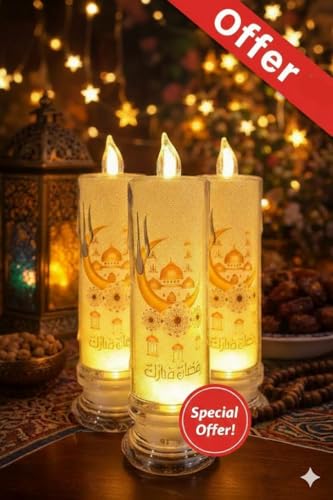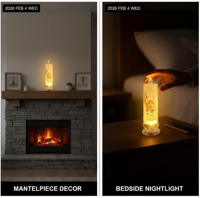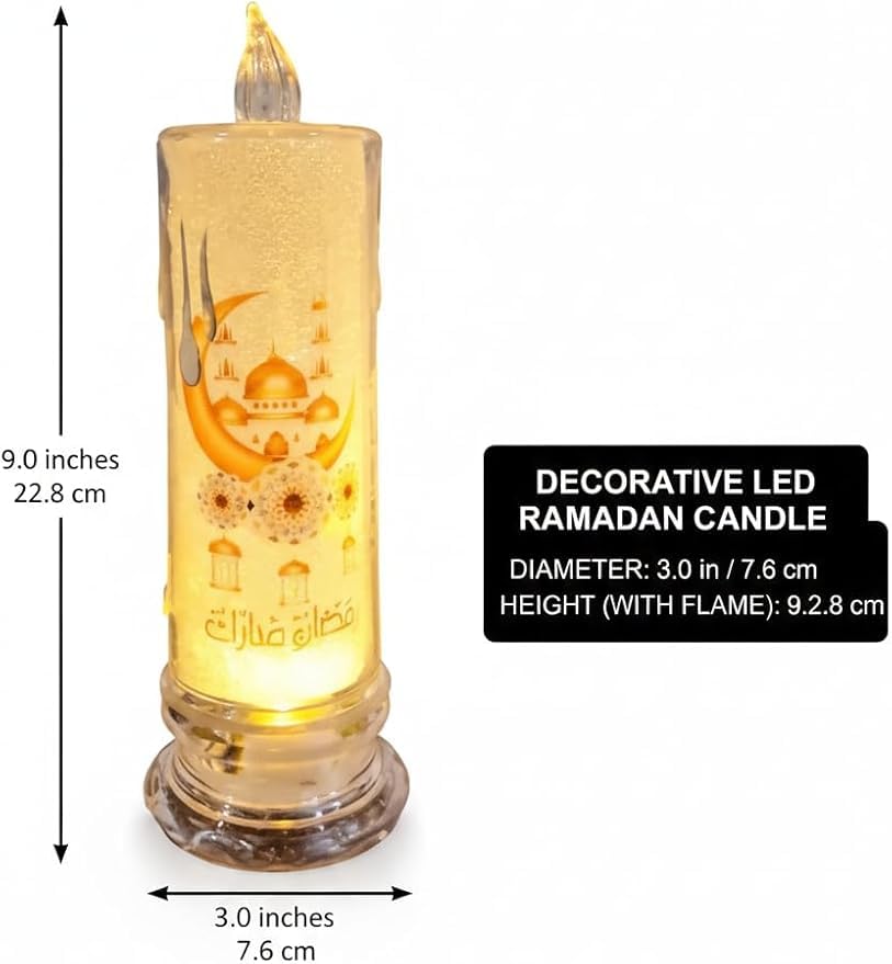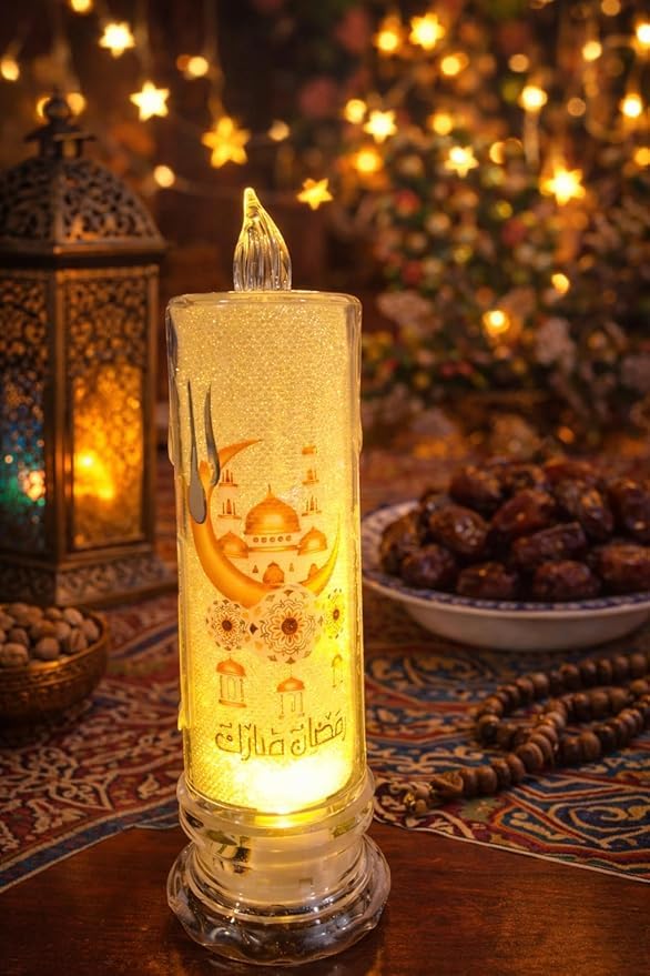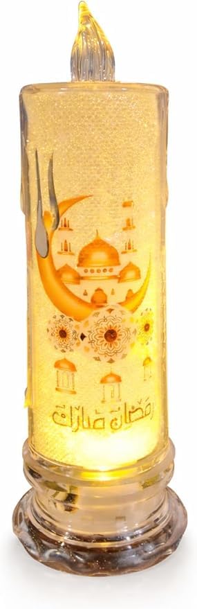 - تصميم رمضاني مميز: شمعة LED زخرفية بتصميم مسجد إسلامي مع هلال وزخارف ذهبية لامعة، مثالية لإضفاء أجواء رمضانية دافئة على منزلك