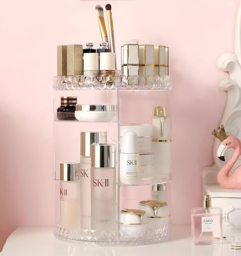 - منظم المكياج الدوار بزاوية 360 درجة مصنوع من الأكريليك الشفاف عالي الجودة بنمط أنيق مقطوع بالألماس، مما يوفر عرضًا أنيقًا ومتينًا لمستلزمات التجميل الخاصة بك. يسمح تصميمه بالوصول السلس إلى جميع العناصر عن طريق الدوران، مما يجعل روتينك اليومي أكثر سلاسة وتنظيمًا.