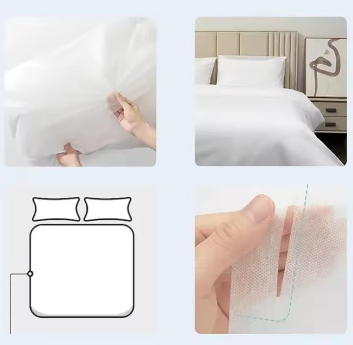 - مجموعة السفر: طقم ملاءات سرير كامل للاستعمال مرة واحدة مكون من 4 قطع مصمم للفنادق والتخييم والسفر المريح.