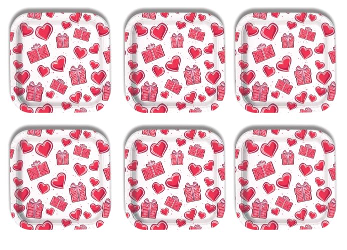Generic - اطباق حفلات للاستعمال مرة واحدة، نمط قلوب وهدايا، بينك وابيض، شكل مربع، 6 قطع