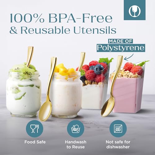 - بلاستيك قوي للاستعمال مرة واحدة - معالق الحلويات الذهبية الصغيرة الخاصة بنا مصنوعة من بلاستيك عالي الجودة وخالي من البيسفينول أ وخفيف الوزن ومتين ومثالي لالتقاط الوجبات الخفيفة والمقبلات بحجم القضمة ويمكنك حتى إعادة تدويرها للمساعدة في تقليل المخلفات البلاستيكية