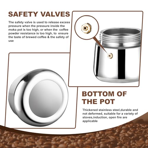 - تصميم من الستانلس ستيل: هيكل ماكينة تحضير قهوة الاسبريسو مصقول ومصمم من الستانلس ستيل الناعم، مع خيوط دقيقة ثلاثية الحلقات، مجهزة بصمام أمان عالي الأداء مقاوم للضغط، تصميم ضمان أمان مزدوج، يمنع بشكل فعال حالات الضغط الزائد. الطلاء المصنفر داخل وعاء الموكا ليس مصنوعًا من الألومنيوم، ولكن يتم معالجته بعملية السفع الرملي الدقيقة، مما يعزز الملمس العام والمتانة