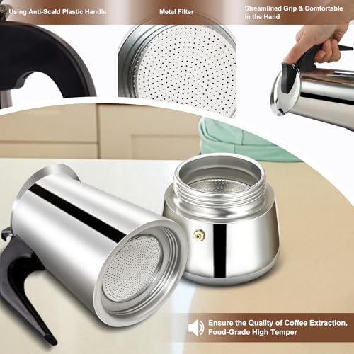 - متوافق مع جميع المواقد: ماكينة تحضير الاسبريسو هذه مناسبة لأي موقد، مثل الغاز وموقد الحث وموقد السيراميك والموقد الكهربائي وموقد الكحول وموقد التخييم البروبان. لا تحتاج إلى الخروج، يمكنك بسهولة صنع اللاتيه والموكا والعصائر والماكياتو والكابتشينو المفضلة لديك. نحن نستخدم مكونات عالية الجودة لجعل الاستخراج، مما يجعل القهوة أكثر نكهة وتمنحك متعة عالية الجودة للقهوة