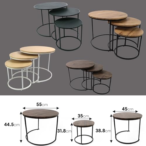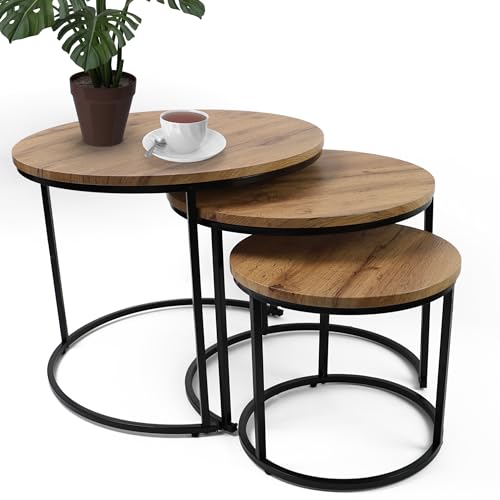 DIVCHI - ديفيشي مجموعة طاولات جانبية دائرية متداخلة من 3 قطع مظهر خشبي عصري مع قاعدة معدنية للمساحات الصغيرة طاولة بجانب السرير لغرفة المعيشة وغرفة النوم والشرفة بلوط فاتح