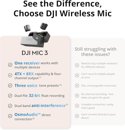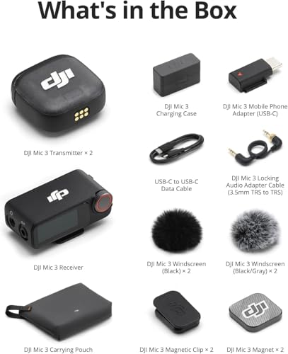 - يتضمن اثنين من ميكروفون DJI 3 TX، واحد RX، علبة شحن، محول ميكروفون 3 للهاتف المحمول (USB-C)، وأكثر من ذلك. سجل صوتين بسهولة وحافظ على طاقتك لمدة تصل إلى 28 ساعة من التصوير.