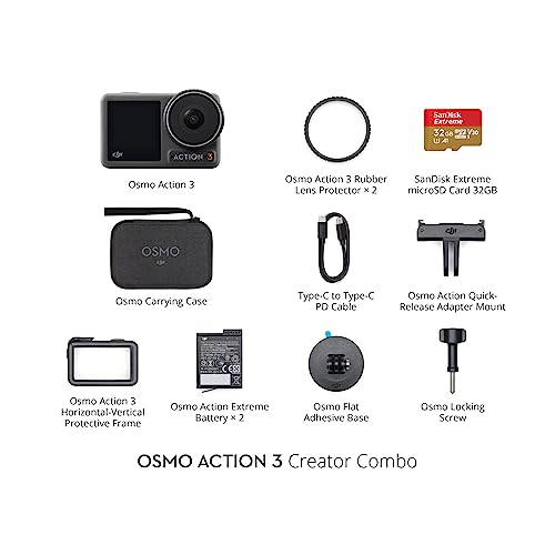 DJI - كاميرا اوزمو اكشن 3 كرييتور من دي جيه اي بدقة 4K + مجال رؤية واسع للغاية 155 درجة وعمق لون 10 بت، تثبيت، مقاومة للبرودة، بطاريتان وبطاقة ميكرو اس دي 32 جيجابايت، كاميرا صغيرة مناسبة لمدونات الفيديو