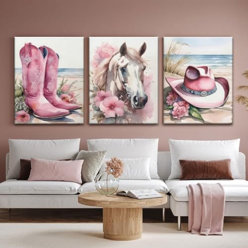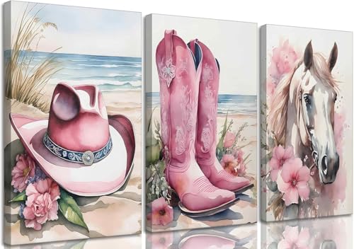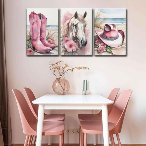 Djmwtb - لوحة فنية جدارية من القماش بتصميم راعية البقر الساحلي لتزيين غرفة الفتيات الغربية دي جيه ام دبليو تي بي مجموعة مكونة 3 قطع زهور وردية وقبعة وصور حصان عصرية مطبوعة بالوان مائية لغرفة متعدد الألوان