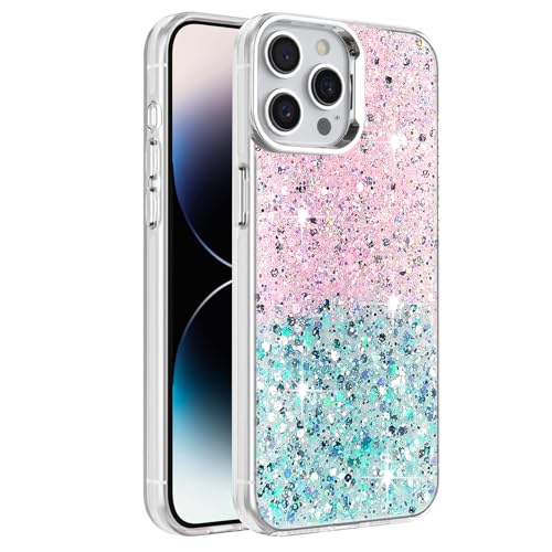 Dl3 Mobilak - دلـع موبايلك جراب متوافق مع ايفون 14 برو (6.1 انش)، جراب شفاف لامع ولامع، اطار من البولي يوريثين الحراري الناعم، غطاء خلفي صلب للنساء والفتيات، جراب حماية شفاف (بينك واخضر)