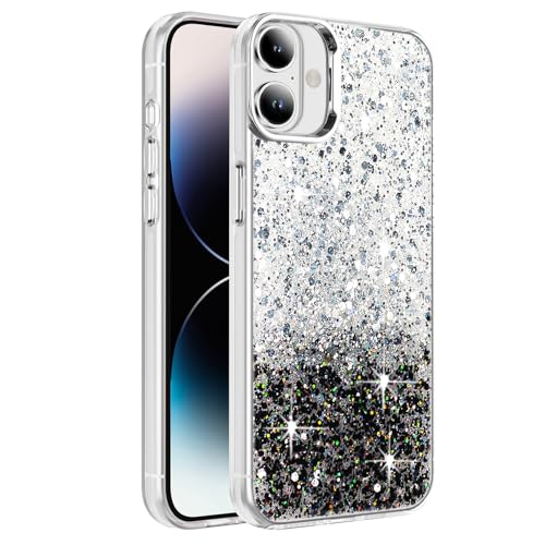 Dl3 Mobilak - جراب حماية شفاف ولامع مزين بالجليتر مع إطار من البولي يوريثين المقاوم للحرارة الناعم وغطاء خلفي صلب للنساء والبنات متوافق مع موبايل آيفون 16 مقاس 6.1 بوصة من دلع موبايلك (أبيض وأسود)