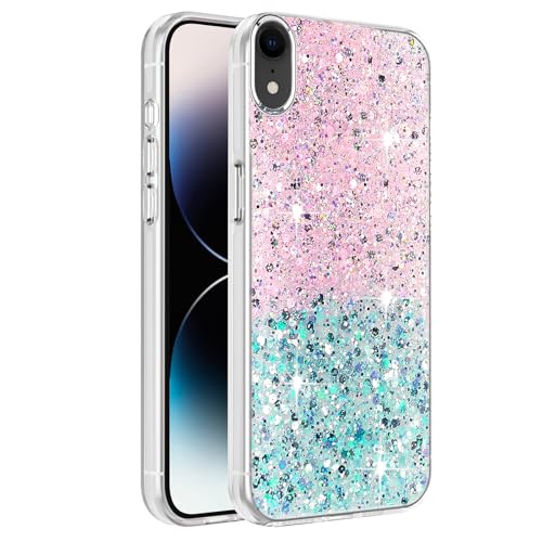 Dl3 Mobilak - دلـع موبايلك جراب حماية شفاف لامع متوافق مع ايفون اكس ار، اطار من البولي يوريثين الحراري الناعم، غطاء خلفي صلب للنساء والفتيات، جراب حماية شفاف (بينك واخضر)