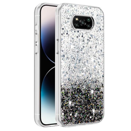 Dl3 Mobilak - جراب حماية شفاف ولامع مزين بالجليتر مع إطار من البولي يوريثين المقاوم للحرارة الناعم وغطاء خلفي صلب للنساء والبنات متوافق مع موبايل مع بوكو NFC X3/ بوكوX3/ بوكو X3 برو (أبيض وأسود) من دلـع موبايلك