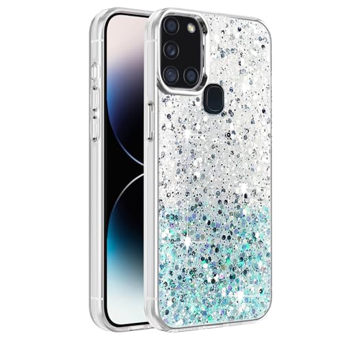 Dl3 Mobilak - جراب حماية شفاف ولامع مزين بالجليتر مع إطار من البولي يوريثين المقاوم للحرارة الناعم وغطاء خلفي متين للنساء والبنات متوافق مع موبايل سامسونج جالاكسي A21s من دلع موبايلك (أبيض أخضر)