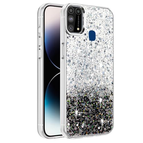 Dl3 Mobilak - جراب حماية شفاف لامع مزين بالجليتر مع إطار من البولي يوريثين المقاوم للحرارة الناعم وغطاء خلفي متين للنساء والبنات متوافق مع موبايل سامسونج جالاكسي M31/M21s من دلع موبايلك (أبيض وأسود)