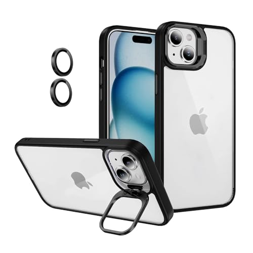 Dl3 Mobilak - دلـع موبايلك جراب شفاف لموبايل ايفون 15 6.1 بوصة مع مسند وحامل حلقي مدمج للكاميرا غطاء واقي للعدسة خلفي صلب مقاوم للصدمات من البولي يوريثين الحراري الناعم - اسود