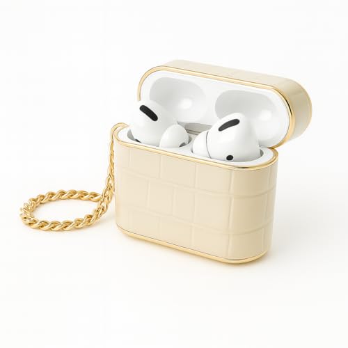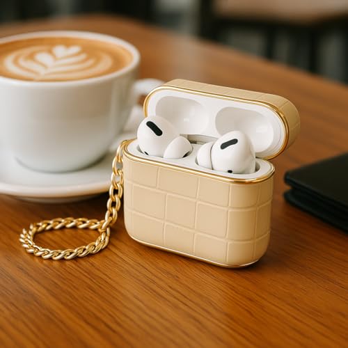 Dl3 Mobilak - دلـع موبايلك حافظة ايربودز برو 1/2 فاخرة مع سلسلة ذهبية، غطاء واقي من جلد البولي يوريثين بنمط جلد التمساح لابل ايربودز برو 2/1، مضاد للصدمات، هدية انيقة للنساء والرجال (بيج دافئ)