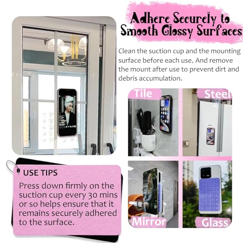 - 【ملاحظة】يمكنك ربط حامل الموبايل بالقاعدة اللاصقة بسطح أملس مثل المرايا أو الزجاج. مع التأكد من أن الموبايل ملتصق بإحكام قبل تحرير يدك، حيث يرتبط وقت الامتصاص بنعومة سطح الجسم الممتص، كما أن تأثير الامتصاص على المرايات والزجاج هو الأفضل، ستضعف قوة الالتصاق لحامل الموبايل ذي القاعدة اللاصقة تدريجيًا بمرور الوقت. يوصى باستخدامه لمدة نصف ساعة كحد أقصى في كل مرة لمنع الموبايل من السقوط.