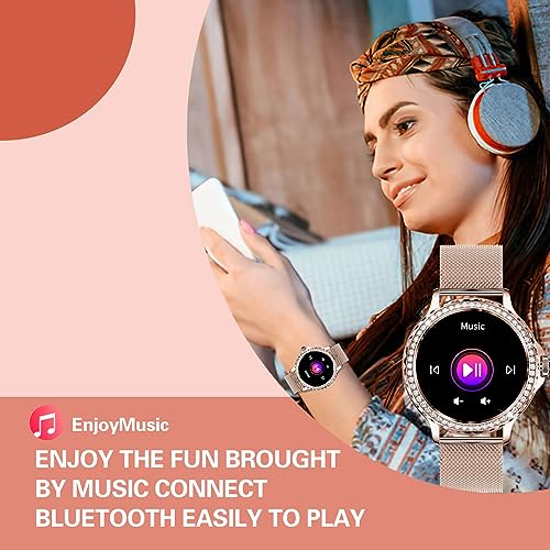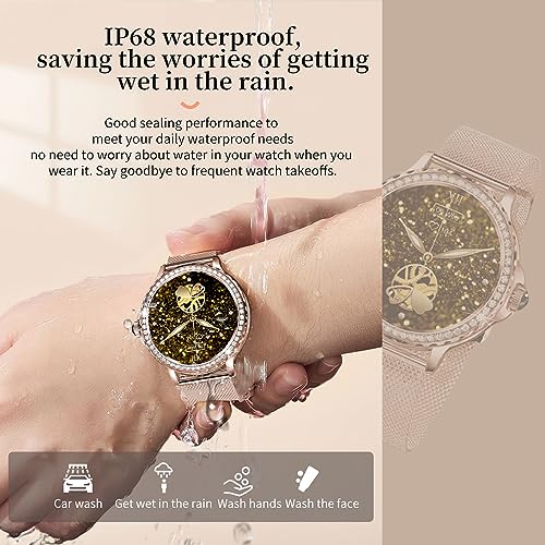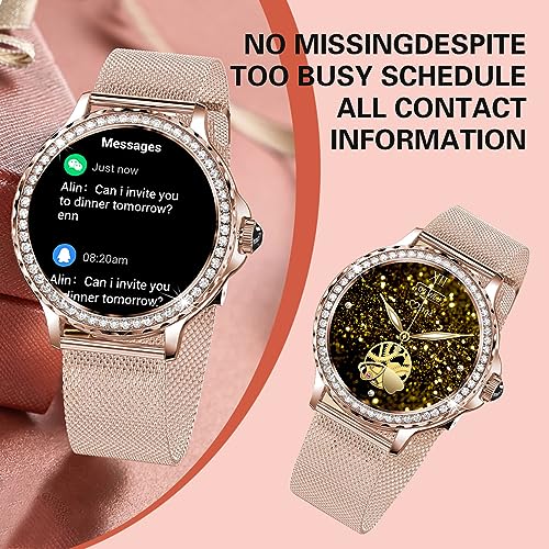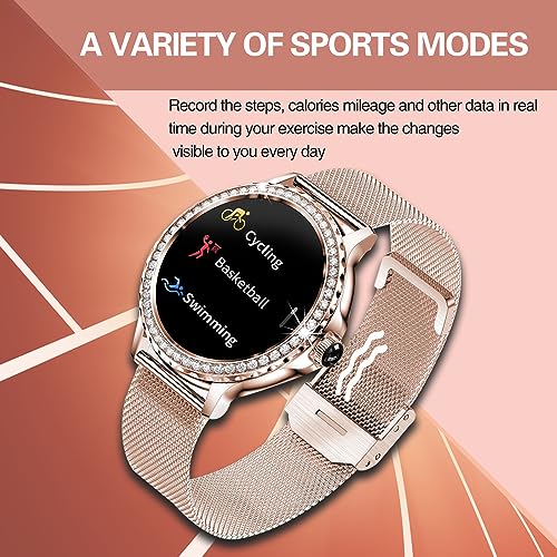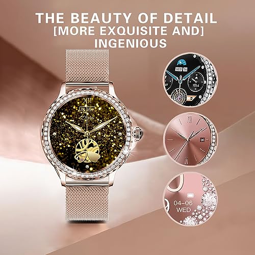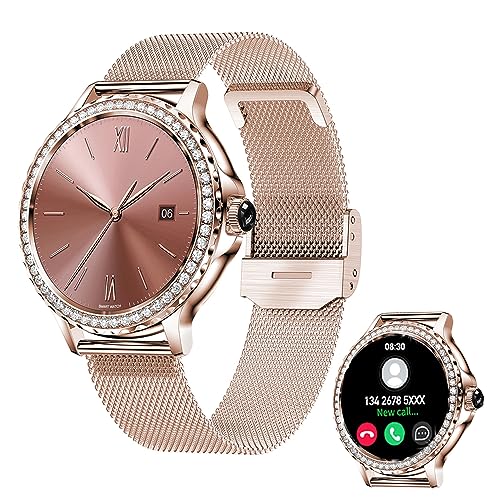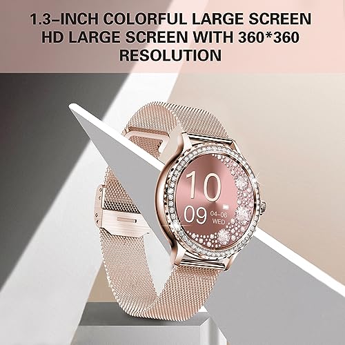 DMG TECH - ساعة ذكية للنساء من دي ام جي الرد / اجراء المكالمات مع الماس 1.3 انش متوافقة ايفون واندرويد مقاومة للماء IP68 اكثر 100 وضع رياضي ساعات لياقة بدنية معدل ضربات القلب/تشبع ذهبي وردي