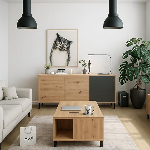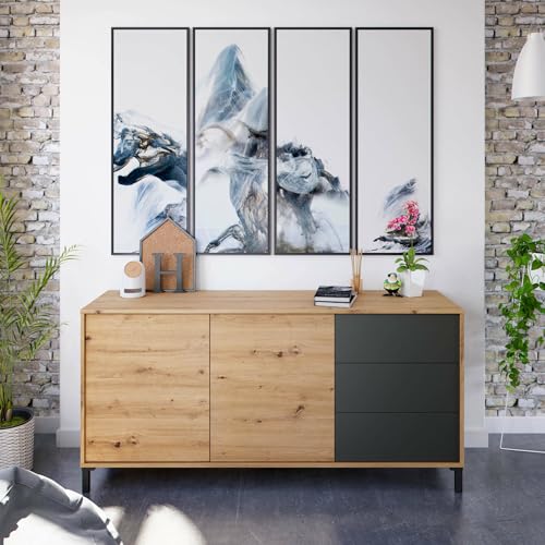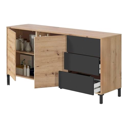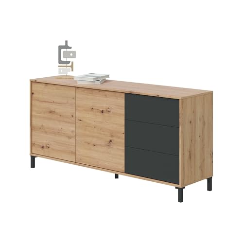 Dmora - دولاب جانبي حديث مزود ببابين و3 أدراج بتصميم بتأثير العقد الخشب كوحدة تخزين للتلفزيون في غرفة المعيشة أو بوفيه للمطبخ من دمورا، لون بلوط ورصاصي، مقاس 1.54 متر × 41 سم × 74 سم