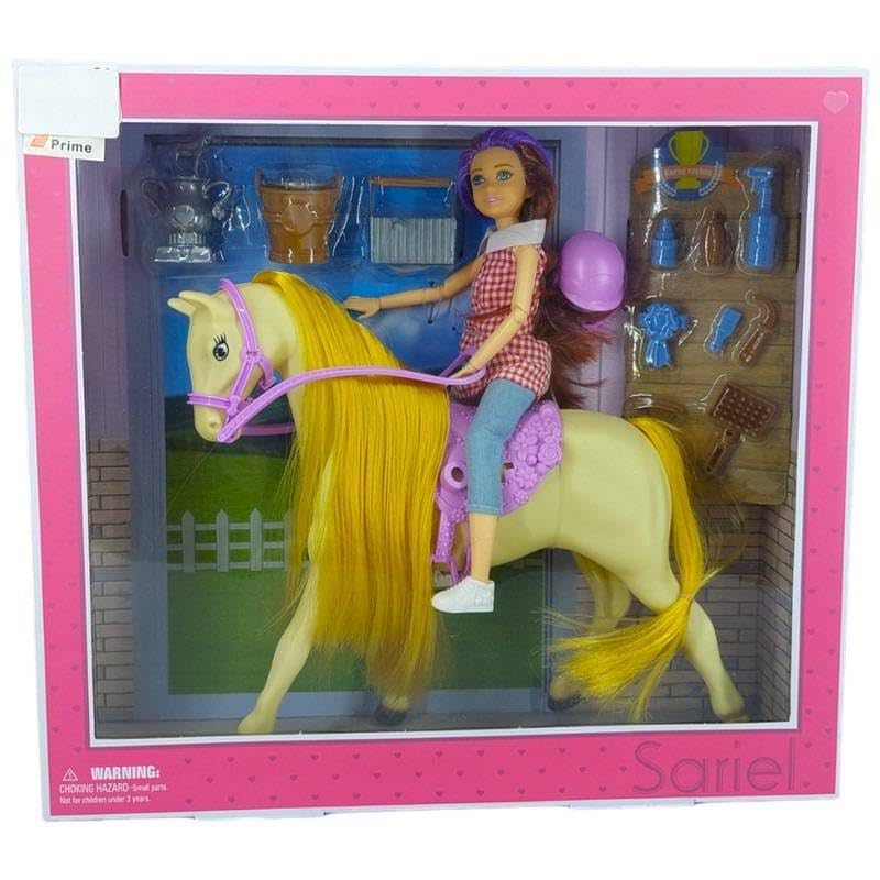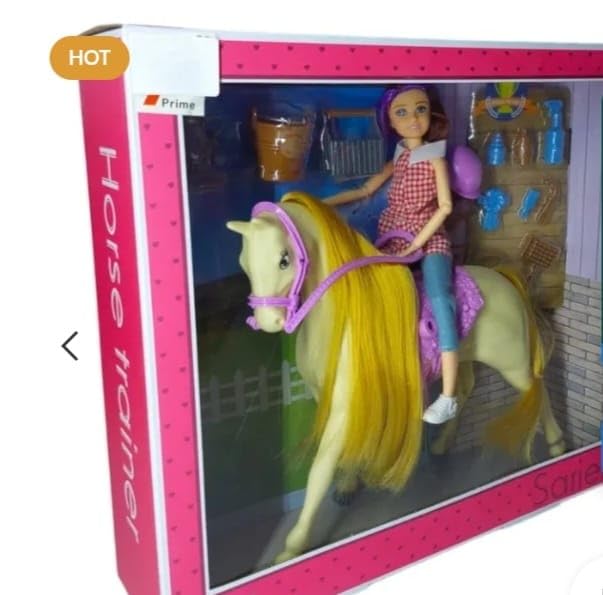 - محتويات المجموعة: تتضمن دمية بملابس عصرية، حصان بشعر أصفر طويل قابل للتمشيط، وإكسسوارات اسطبل متنوعة مثل خوذة ركوب، فرشاة، دلو، وأدوات عناية بالحصان