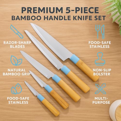 - طقم سكاكين شيف كامل مكون من 5 قطع - مجموعة سكاكين مطبخ أساسية: سكين شيف وسكين تقطيع وسكين خبز وسكين متعددة الاستخدامات وسكين تقشير لإعداد وجبات متعددة.