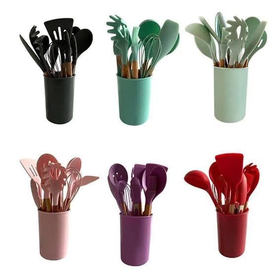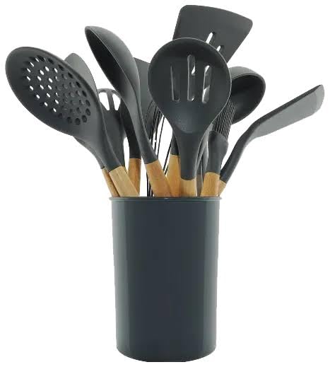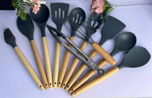 Dollar for Import - طقم موزع مطبخ سيليكون مقاوم للحرارة من دولار فور امبروت، 12 قطعة بمقبض خشبي، اسود