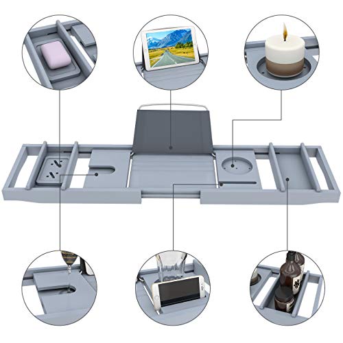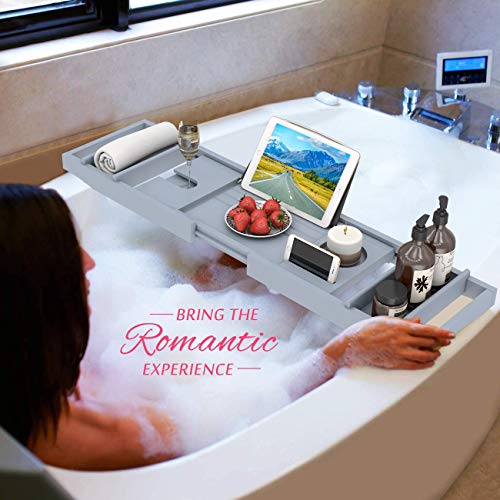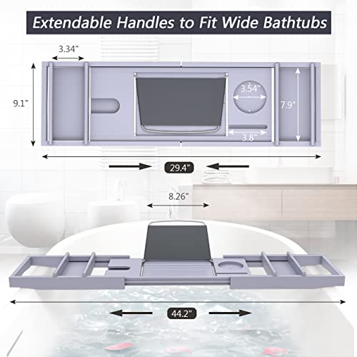 Domax - دوماكس صينية حوض استحمام قابلة للتوسيع من الخيزران للحمام الفاخر مع حامل كتب وطبق صابون مجاني (رمادي، 29.5 انش - 44.5 انش × 9.1 انش × 1.65 انش)