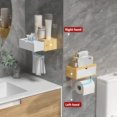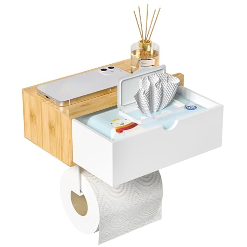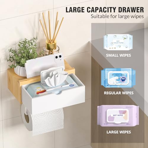 Domax - حامل ورق تواليت برف ودرج تخزين من خشب البامبو للتثبيت على الحائط باستخدام لاصق، لتنظيم المناديل والمناديل المبللة لأي غرفة من دوماكس - لون خشب البامبو وأبيض، مقاس متوسط