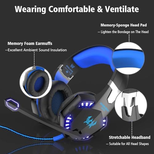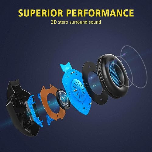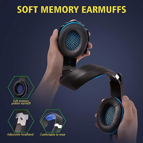 Domfish - سماعات راس ستيريو للالعاب بخاصية تقليل الضوضاء من دومفيش فوق الاذن مع ميكروفون الغاء واضاءة LED احترافية للكمبيوتر واللاب توب هدية للاولاد أزرق