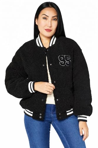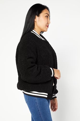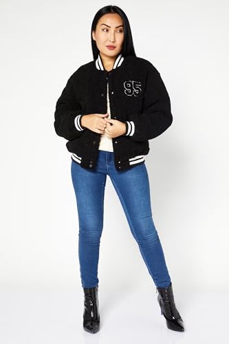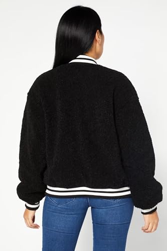 Jennyfer - جاكيت منفوخ للنساء من دونت كول مي جينيفير من الصوف باللون الاسود مع رقعة مطرزة 95، نمط فارسيتي مع حواف مخططة، اغلاق بزر كبس