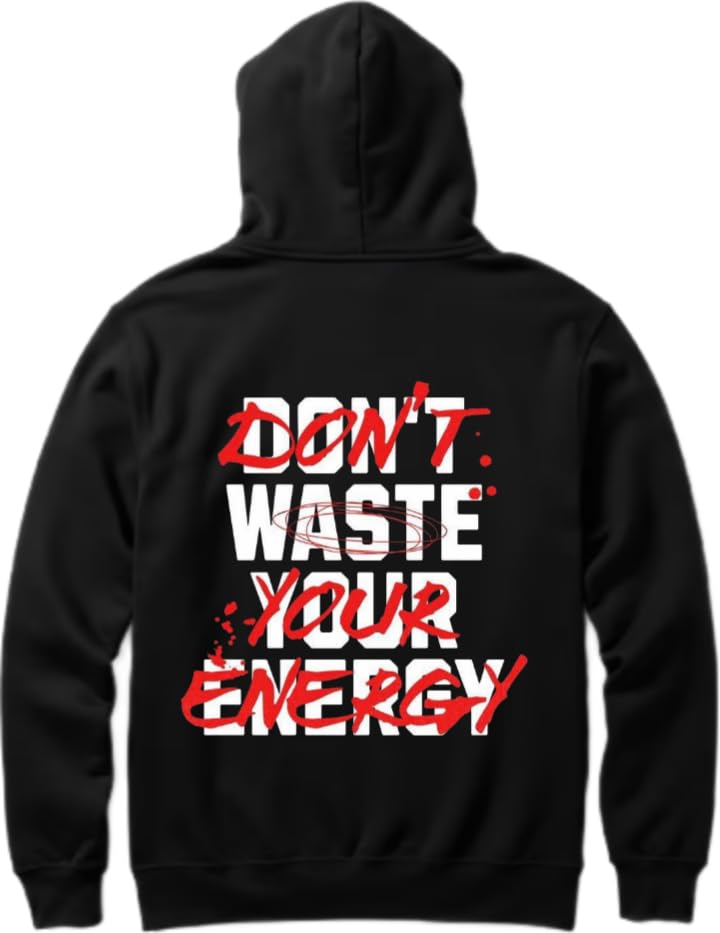 Generic - سترة بغطاء رأس من الخلف مطبوع عليها DON'T WASTE YOUR ENERGY باللون الأسود