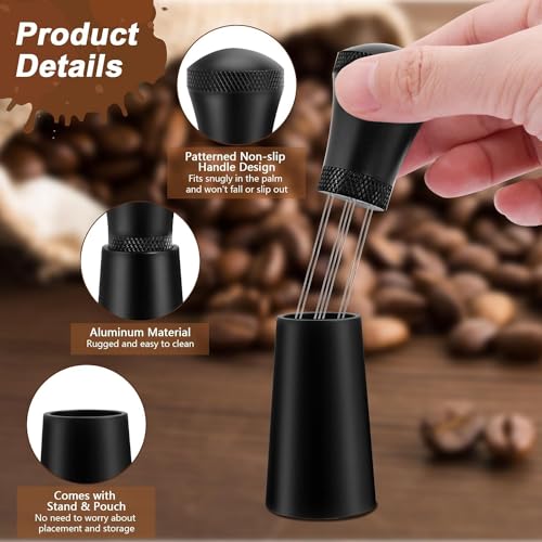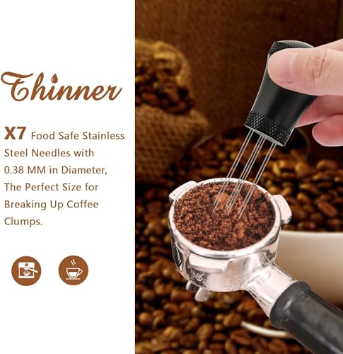 DOOKOO - أداة توزيع الإسبريسو دي دبليو تي مزودة بـ7 إبر بسمك 0.35 ملم لتحريك قهوة الإسبريسو، مناسبة للبارستا وتأتي مع 10 إبر إضافية بديلة وشنطة، مقبض من الألمنيوم مع حامل أسود غير لامع من دوكو